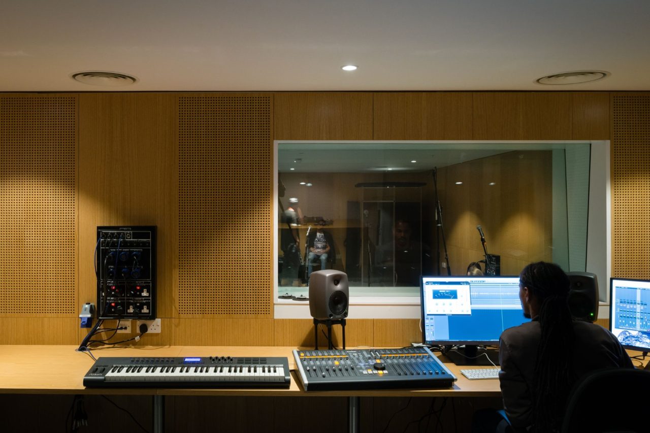 The studio is available to hire for voiceover work and recording sessions. The Recording Studio live room is 5.5 by 8 metres.